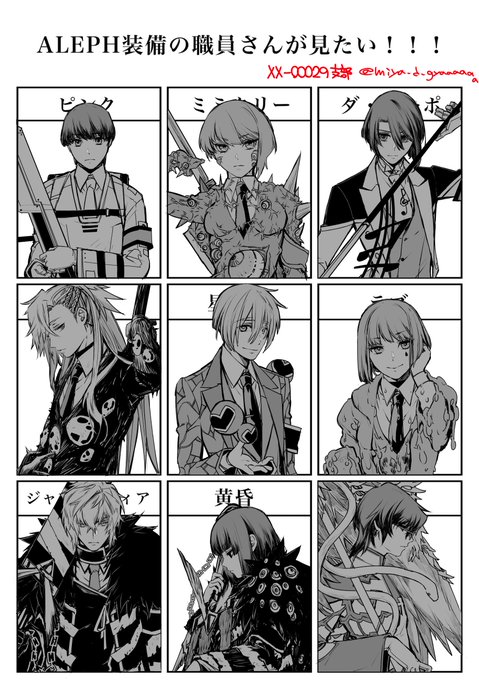 #弊支部ALEPH職員さん 描いてみたかったてんぷれおかりしました! 半分くらいいつもの抽出チームの連中になってしまった…… また気力があったら色をぬってあげなおしたり、黄昏以外は同じ装備のもう片方の職員さんで描くかもしれない