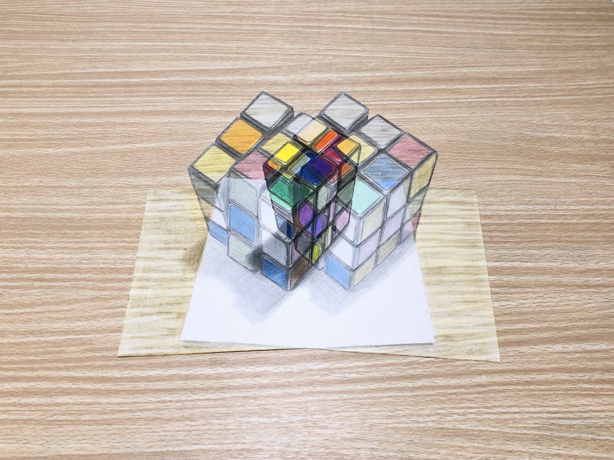#作った本人も作り方説明するのむずかしい作品 #色鉛筆画 大きさを合わせ、向こう側の景色と位置を合わせ、色を合わせ… 具体的にどうやったかはヒミツ