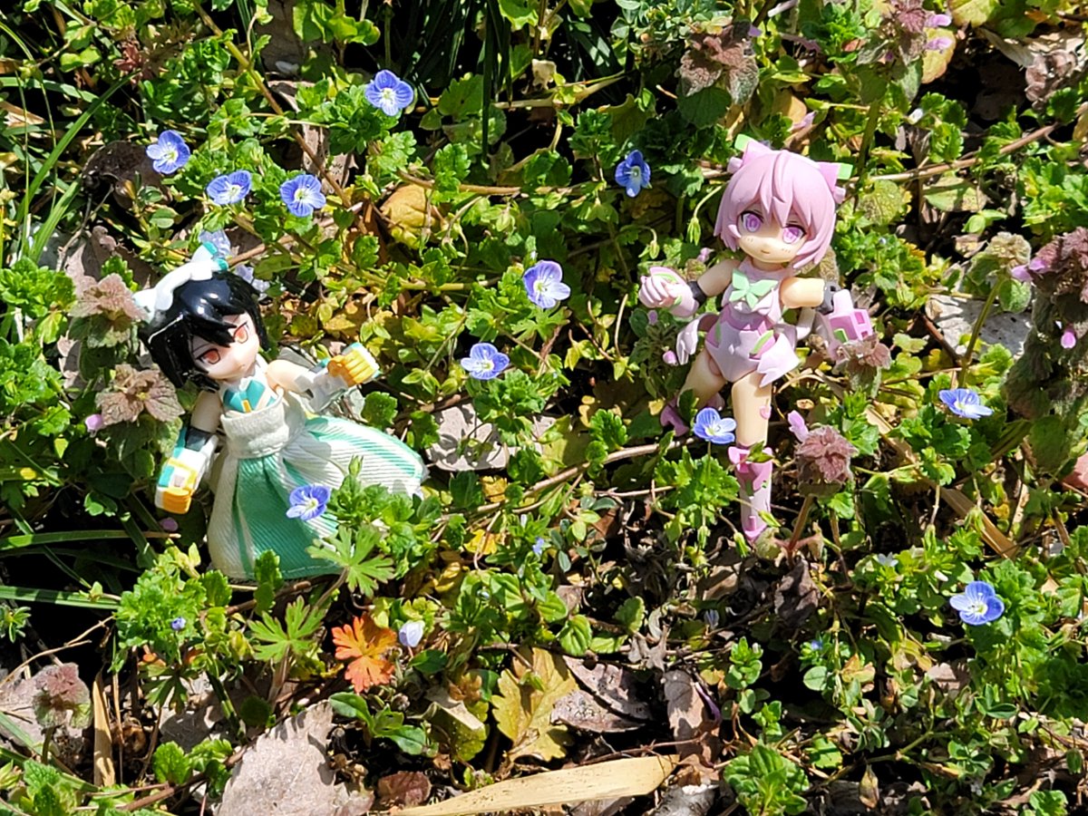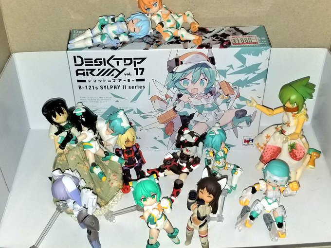我が家のシルフィーII4シーズンズ。 #デスクトップアーミー 「緑増しでこれこそ晩春仕様、むふん。」 「いいね~。」 「キミはコレで髪染めて完成だよね。」 「……(パーツ換装じゃないの??)」