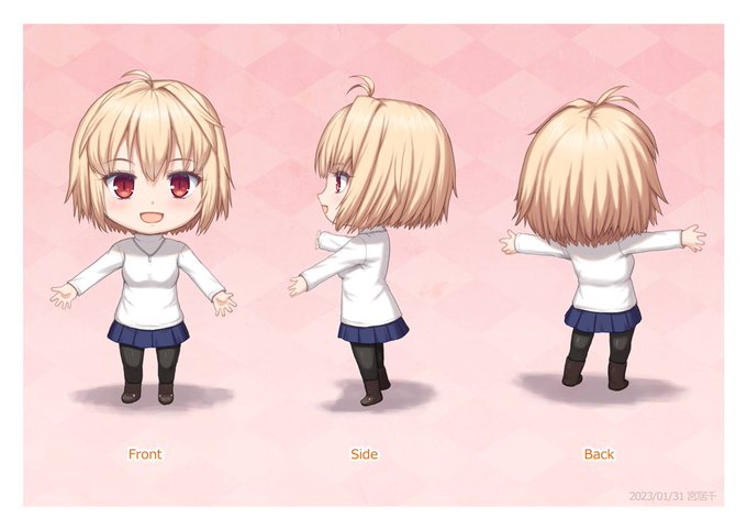 ねんどろいどアルクェイドをスケッチしつつ、自分の絵柄に落とし込んでみるテスト。意図せず三面図のようになってしまったので、それっぽく仕上げました。#月姫 miyaimax.tumblr.com/post/707956030…