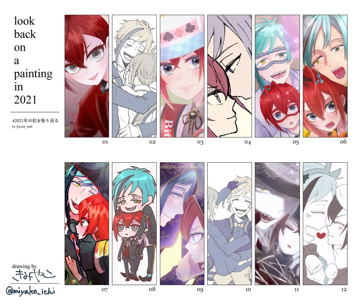 #2021年の絵を振り返る 最早、月ごとではなく、今年描いたやつを12コ引っ張り出して描いた順(たぶん…)に並べてみました!自分的にはいつも以上に描いた年!来年もフリをたくさん描きたいな!見てくださってありがとうございました☺️ テンプレお借りしました~!