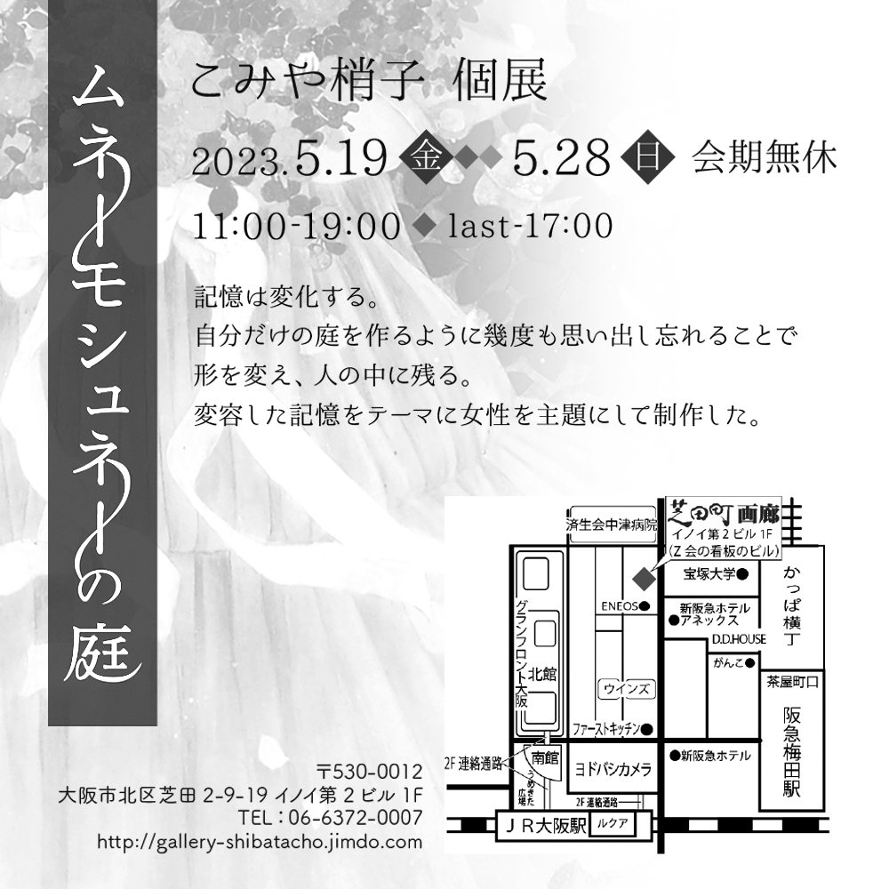 【個展おしらせ】 こみや梢子個展 「ムネーモシュネーの庭」 2023.5.19(金)〜5.28(日) 11時〜19時(最終日は17時) ※会期中無休 芝田町画廊 大阪市北区芝田2-9-19イノイ第2ビル1F gallery-shibatacho.jimdo.com ひさしぶりに関西で個展を開催をさせていだきます。 どうぞよろしくお願いいたします。