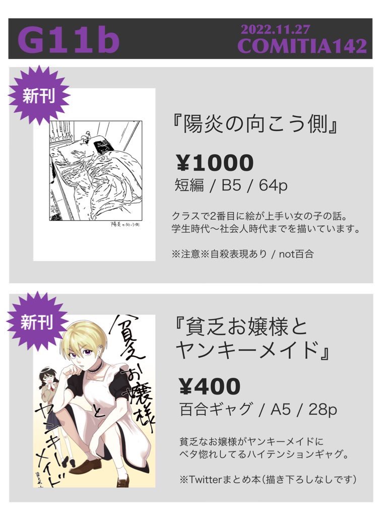 お品書き 11/27(日)コミティア142 ○【G11b】西1ホール ○漫画本2冊あります 初参加です。よろしくお願いします! #COMITIA142 #コミティア142