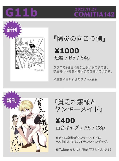 2 7 お品書き 11/27(日)コミティア142 ○【G11b】西1ホール ○漫画本2冊あります 初参加です。よろしくお願いします! #COMITIA142 #コミティア142 22/11/26 11:30