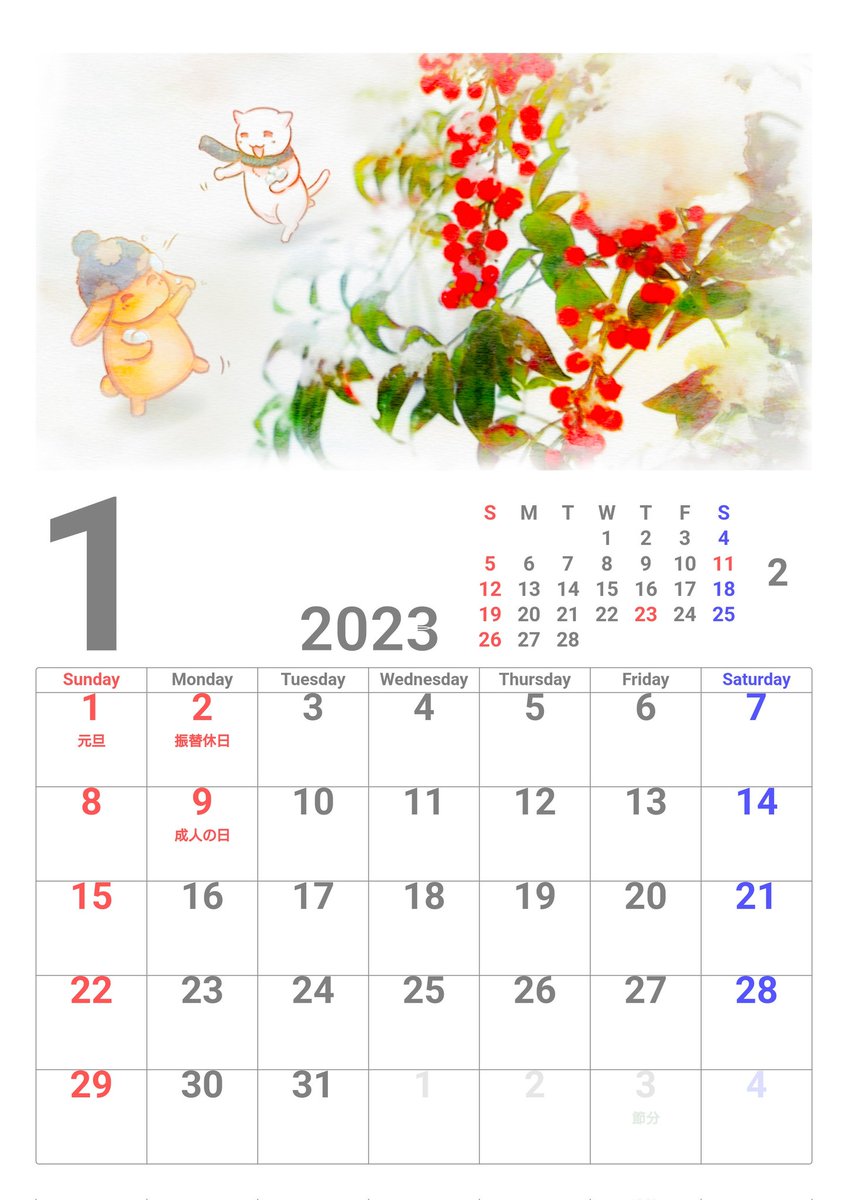 2023年✨1月の無料カレンダーです😊スマホのロック画面などにどうぞ💐 今年もよろしくお願いいたします💕😆 近いうちにかぽりを探せ!版もアップしますね✨ #絵描きさんとつながりたい #カレンダー #猫好きさんと繋がりたい