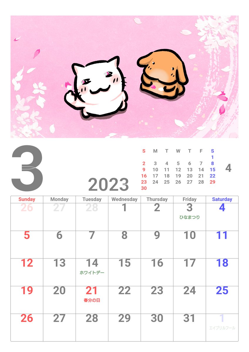 2023年3月の無料配布カレンダーです✨ スマホの画面などにどうぞ🌈 もうすぐ春ですね~🌸 よかったらシェアしてください♪ #絵描きさんと繋がりたい #猫好きさんと繋がりたい #うさぎのいる暮らし