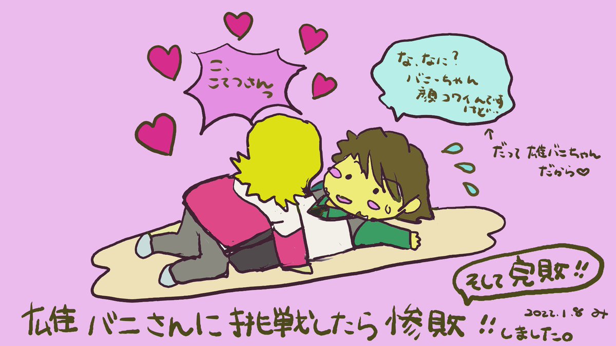 ちょっとだけ、オマケを描いてみましたの巻😅 体がボロボロの虎徹さんと 心がしんどいバニーちゃん対決❗️ 言葉の魔法で癒されるといいのにな…💕 #一日一デジ twitter.com/miyarinkun/sta…