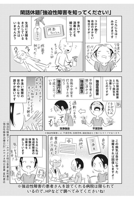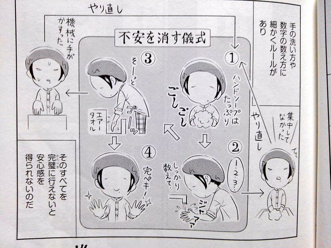 903 1985 【強迫性障害を知ってください!】 強迫性障害は、不快な考え「強迫観念」と、強迫観念を振り払おうとする「強迫行為」から成り立っています。 過剰な手洗いや鍵の確認がよく挙げられますが、症状は人によって違います。 画像は『強迫性障害です!』から。(C)みやざき明日香/星和書店 20/01/22 21:54