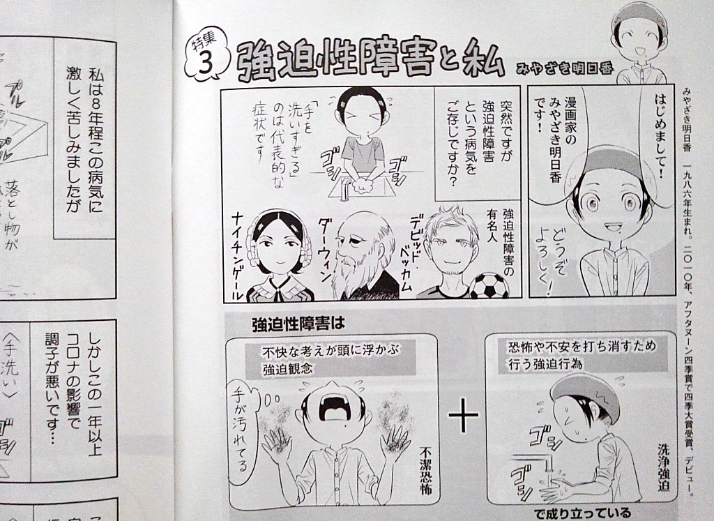 10 52 認定NPO法人 地域精神保健福祉機構(コンボ)さんが発行されているメンタルヘルスマガジン『こころの元気+』さん11号で、強迫性障害について描かせていただきました! 今回の特集は「まんが特集 私の知りたい精神疾患」です! 強迫性障害について、多くの方に知っていただけるといいですね! 21/11/04 21:02