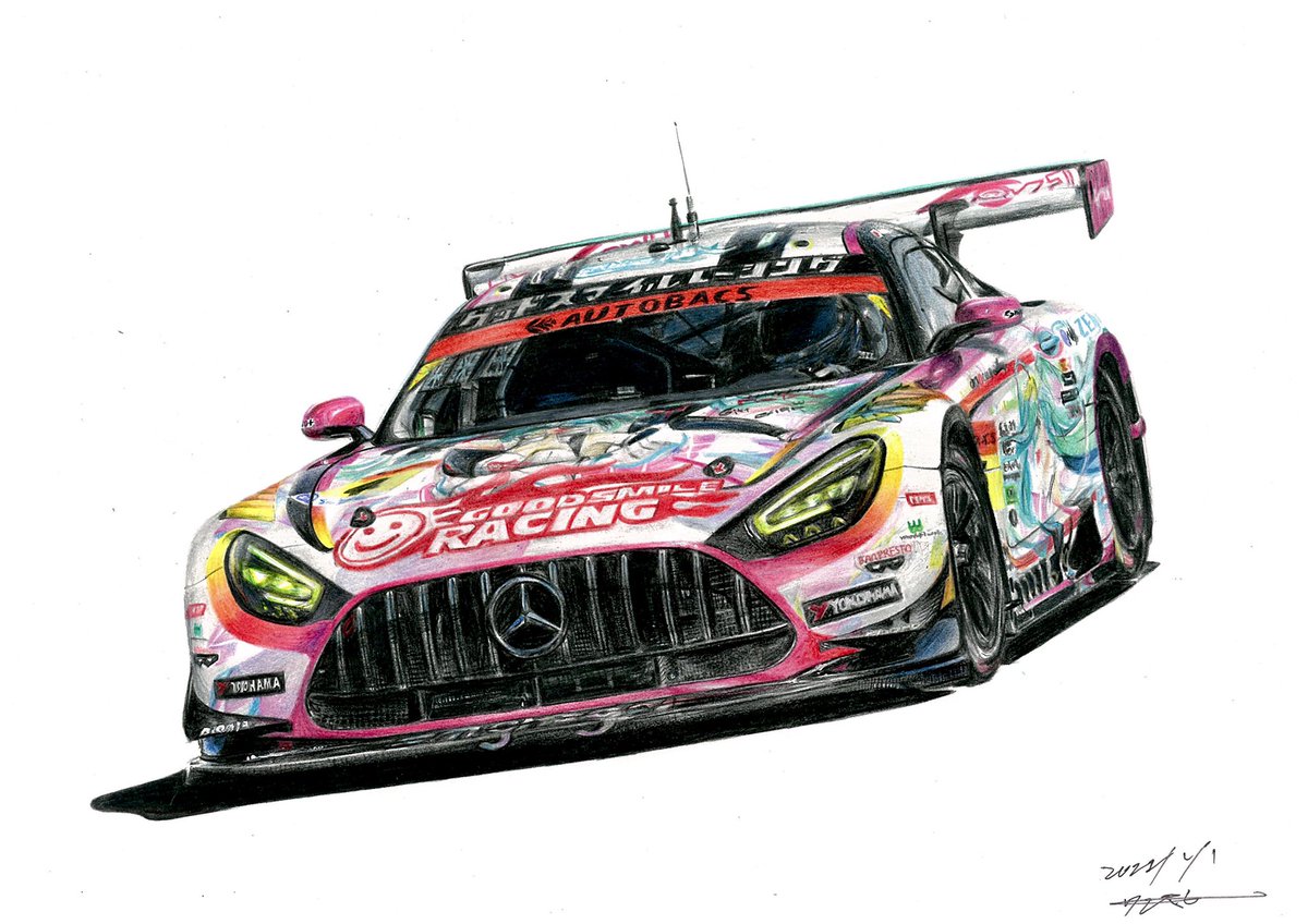 グッドスマイル初音ミクAMGを色鉛筆で描きました! 狂気とも言えるこのマシンカラーリングを、なんとか描き終えることができました。本当に大変でした💦 いろんなところ拡大して見てもらえると嬉しいです😆 #初音ミク #SUPERGT #色鉛筆画