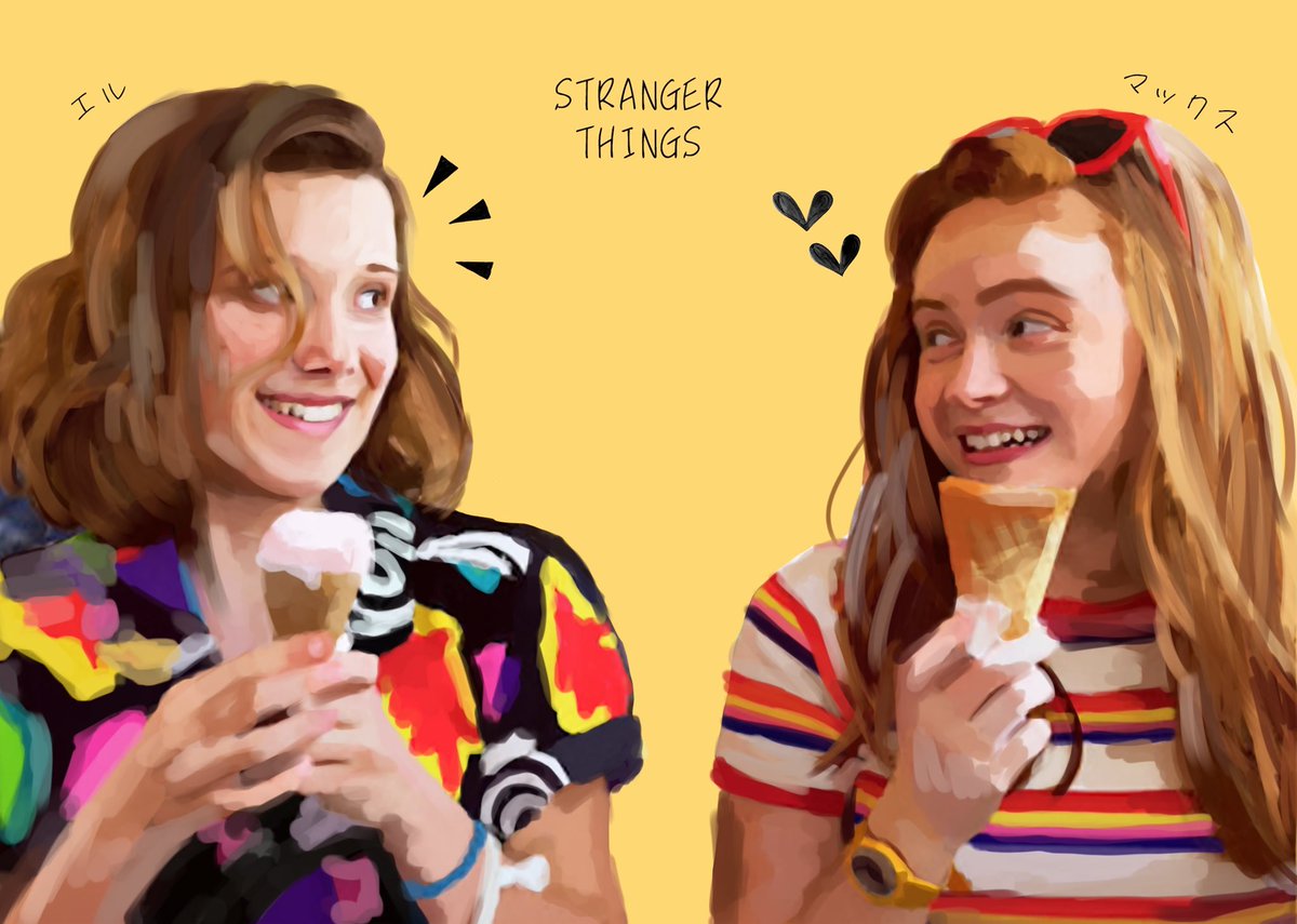 やっと、昨日描き終わった #ストレンジャーシングス のエルとマックスです。 #ストレンジャー・シングス4 も最高に面白かった(7月楽しみ)ですが、やっぱりシーズン3好きなんですよね。特にこの2人の買い物シーン好きなんですよ。可愛い。 シーズン3のファッションや演出がとても好み♡ #イラスト