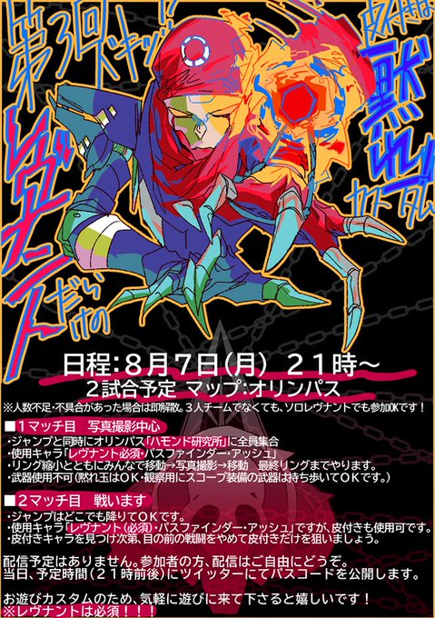 8月7日(月) 21時~ 第3回ドキっ?!レヴナントだらけの皮付きは黙れカスタムやります。宜しくお願いします! ※1マッチ・2マッチでコードを変えてツイートします。