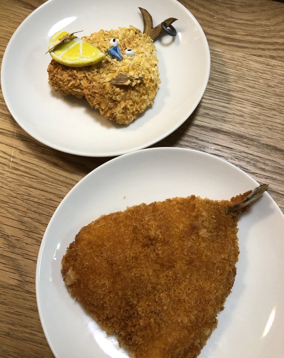 アジフライ(本物)とアジオ(樹脂粘土)🐟最後にニスを塗ったら油っぽい感じが出そう🤔