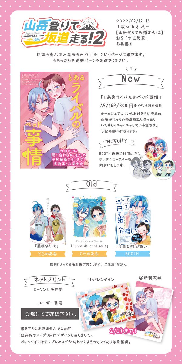 この後の山坂webオンリーお品書きです! 新刊サンプル、通販は固定ツイ お5「水玉製菓」 今日のコアタイムは遅刻しますが、明日は割といると思います! お話して頂けると嬉しいです! よろしくお願い致します!