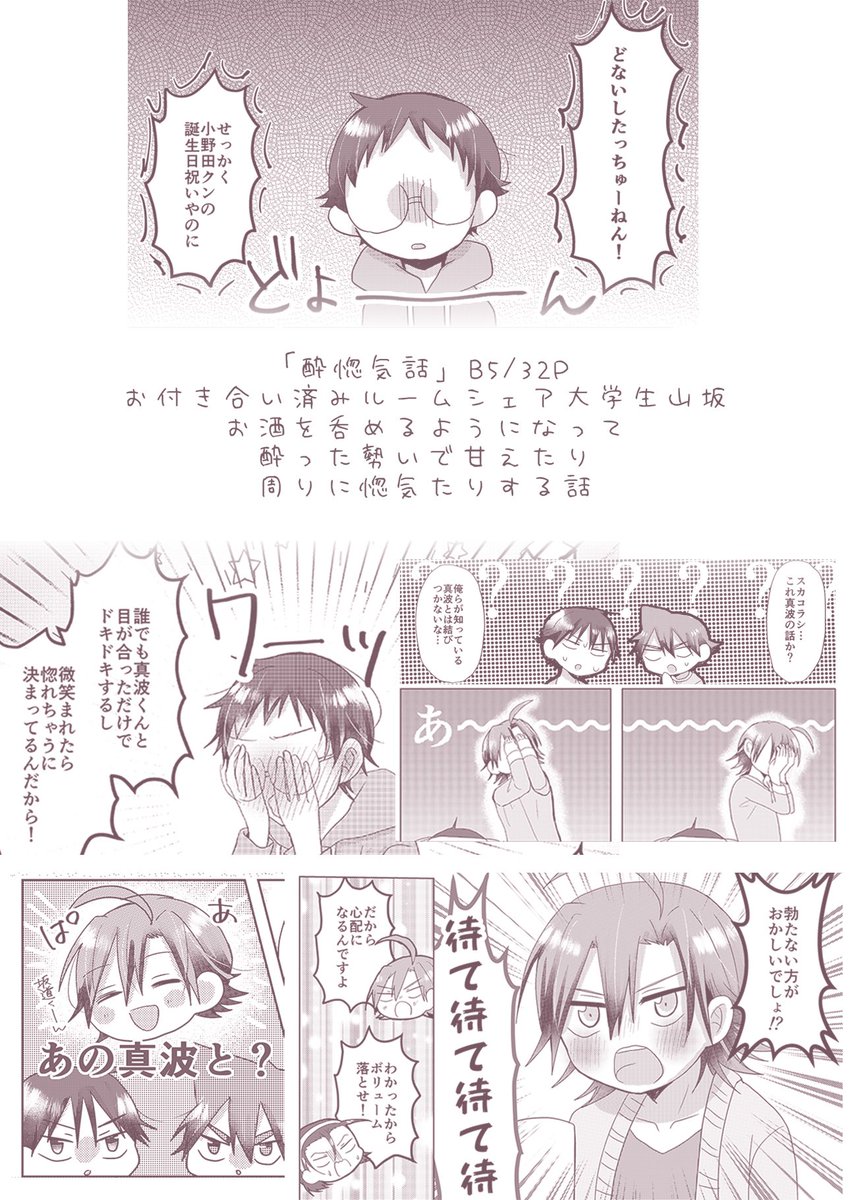 3 2 5/4超全開ケイデンス2023 山あり坂あり3 山坂新刊サンプル「酔惚気話」 B5/32P/¥500 ※イベント頒布価格 お付き合い済みルームシェア大学生山坂 お酒を呑めるようになって酔った勢いで甘えたり周りに惚気たりする話 サンプルは繋がっておりません。 23/05/02 20:21