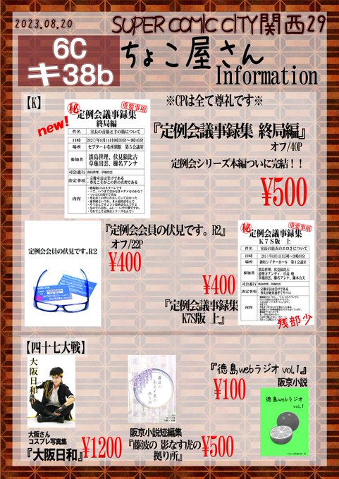 10 15 8月20日SUPER COMIC CITY関西29 お品書きです。 6号館Cゾーン キ38b ちょこ屋さん K尊礼にて参加です。シリーズ物最終巻発行となります! 47本も少ないですが持参致します。 新刊サンプルは後日ツリーに繋ぎます。 23/08/17 07:05