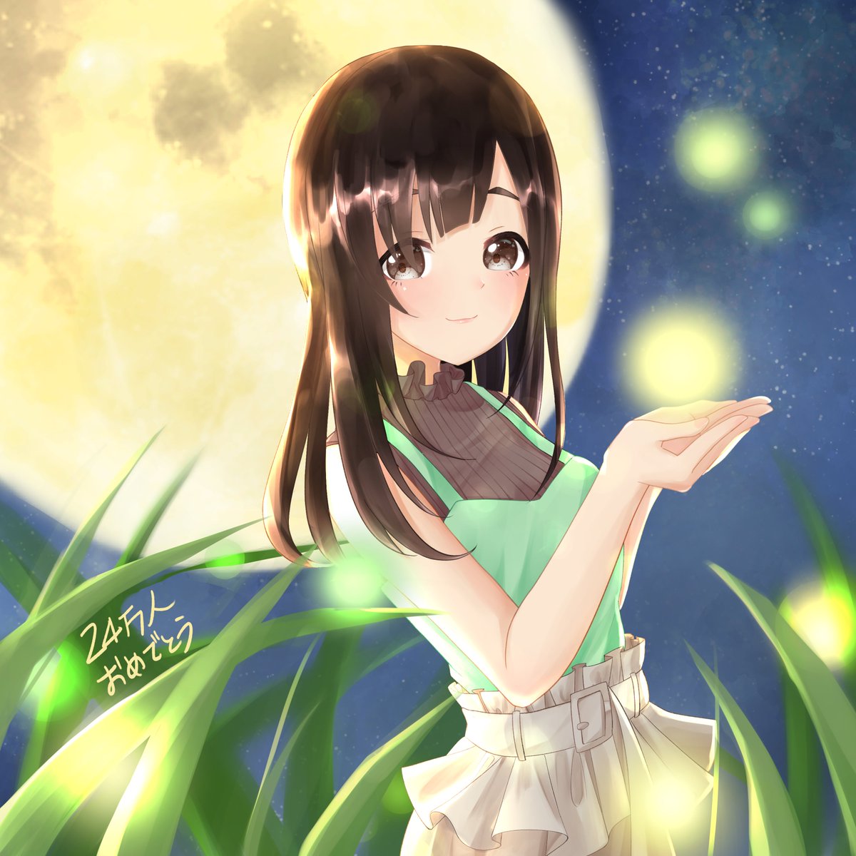 また1万人遅れちゃったけど24万人おめでとう! この前の花火とキョウちゃんも素敵だったけれど蛍と月とキョウちゃんも素敵だろうな~と思って描いてみました! #はなばさみあーと #花鋏キョウ #はなばさ民
