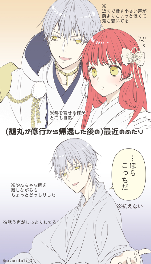 #繋がらなくていいから俺の刀さにを見てくれ 5年くらい前も同じタグに参加してたみたいなんですがまた動いてるみたいなので新しいやつを イチャイチャしたりシリアスしたりしてる鶴さにを色々描いてます☺️ ※鶴さに ※創作女審神者有