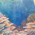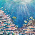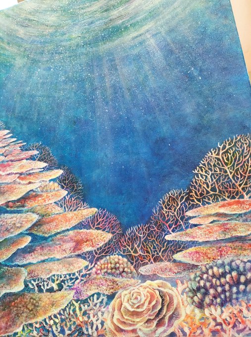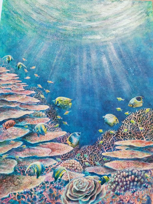 やーっと完成しました! 大好きなパラオ海🇵🇼 海中の多様な色合を出すために、40色以上の絵具を組み合わせて描きました。 作品の中には12種類の魚が泳いでいます🐟 #絵描きさんと繋がりたい #絵 #イラスト #ダイビング #魚 #スキューバダイビング