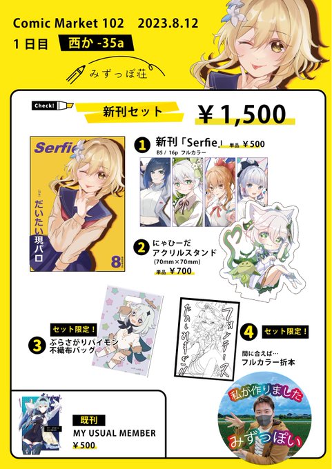 23 30 ◎あなたのサークル「みずっぽ荘」は土曜日 西地区 “か” ブロック 35a に配置されています。 2回抽選漏れして今回やっと😭原神でスペース頂けました!1年ぶりのサークル参加😭がんばります😭 #C102 23/06/09 19:10