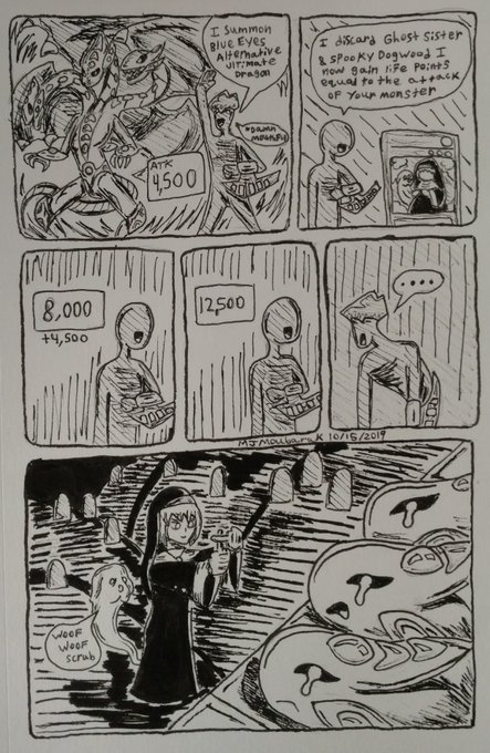 Day 15 of Inktober, DUDE comic 5: And that's all the current Ghost girls! #yugioh #dueldevastator #kaiba #setokaiba #blueeyeswhitedragon #blueeyesalternativeultimatedragon #Konami #kazukitakahashi #Inktober #inktober2019 #Graveyard #ghostgirl #ghost #nuns #doggo