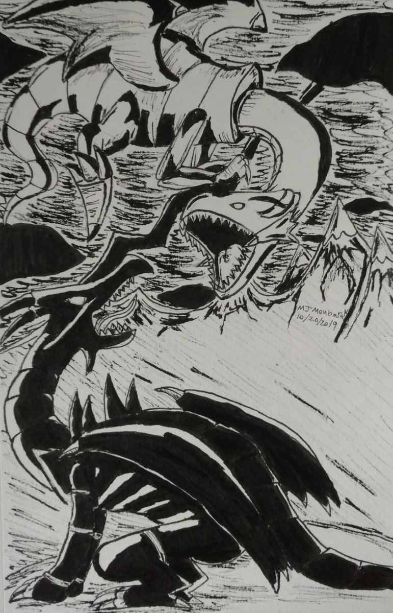 Day 20 of Inktober, more catching up. Will have day 21 up later today. #yugioh #setokaiba #kaiba #blueeyeswhitedragon #redeyesblackdragon #joeywheeler #inktober2019 #rivals #dragons #battle #mountains #blackclouds #lightning #kazukitakahashi