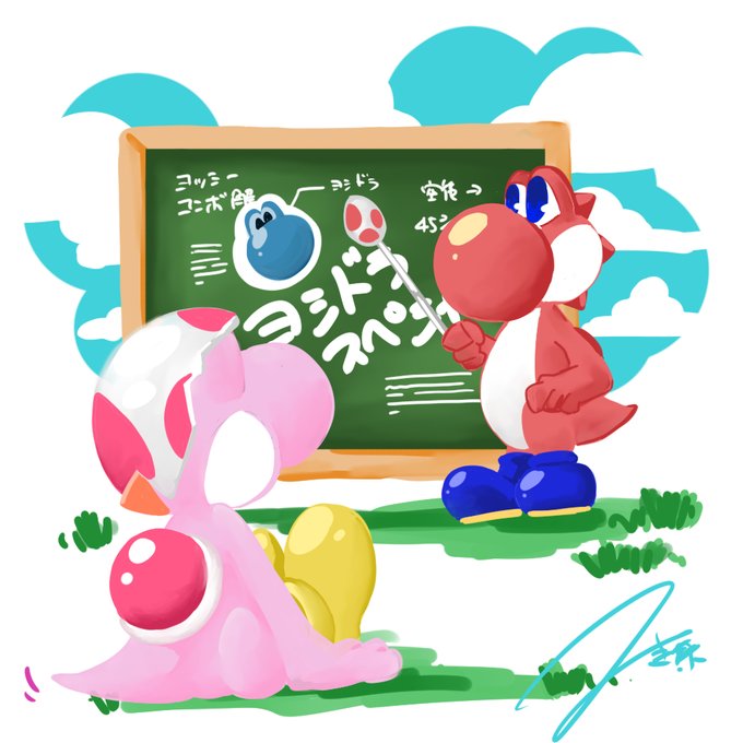 #お絵描き #落書き #ファンアート ロンさんのヨッシー解説を見る生まれたてへろーヨッシーの図。お勉強中だねっ!いつかおふたりで一緒に遊ぶのかな?☺️