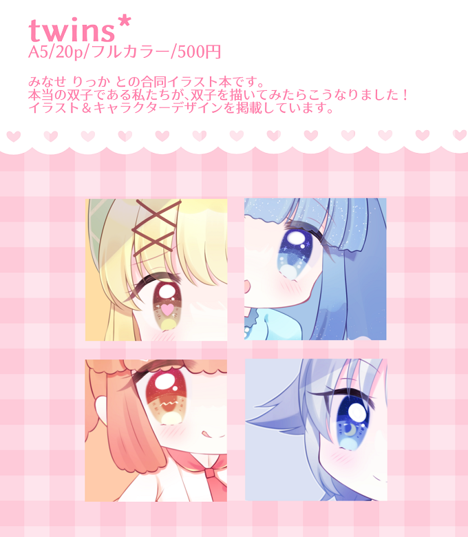 新刊は みなせ りっか(@mns_rikka)との合同イラスト本です✨(当日はスペースもお隣です✨) 「twins*」A5/20P/フルカラー/500円 "双子で作る、双子イラスト本"をテーマに、本当の双子で制作しました! 私の担当ページのサンプルです▶ #コミティア141 #COMITIA141