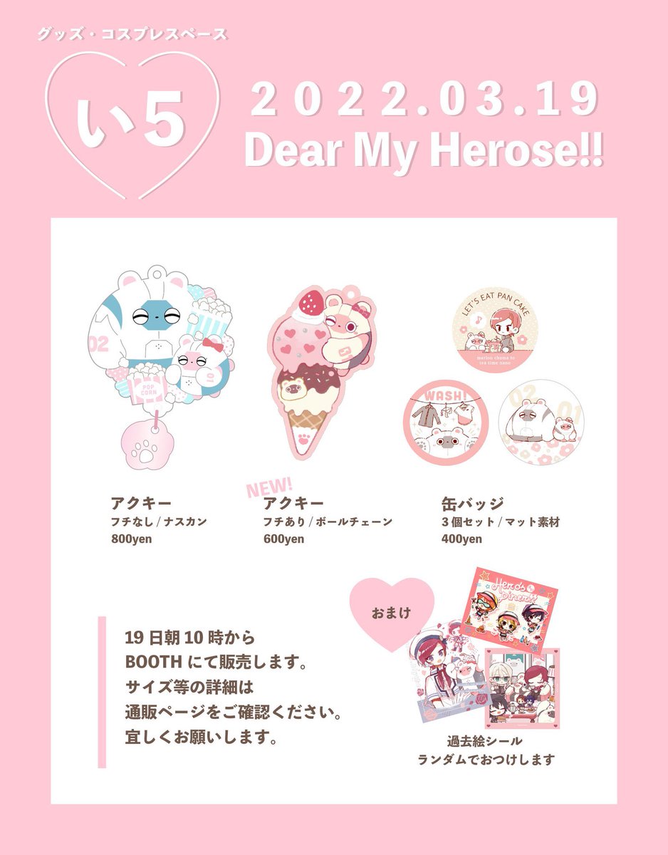 3/19 DMH!!3 参加させて頂きます グッズ・コスプレエリア【い5】 新作はジャクリーンちゃんアイスアクキーのみ 他は再販です🍨 19日の朝10時頃にBOOTHに在庫を追加して通販開始します。よろしくお願いします🙇♀️ @dearmyheroes #DMH20220319