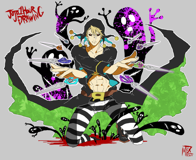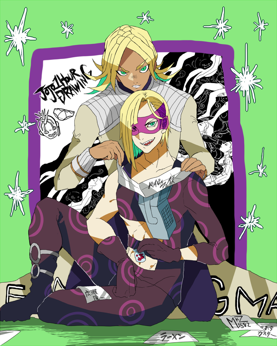 「おまえのパンティーだ!」「受胎完了!」 #JOJO版深夜の真剣お絵描き60分一本勝負 メローネとエニグマ君こと宮本輝之助君。あれはジョジョ二大セクハラ攻撃だと思いました。没ネタのおまけつき