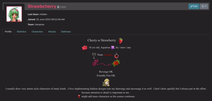 I really like my #artfight2023 profile itself so that’s what I want to share . My first year participating so I will have fun artfight.net/~Strawbcherry