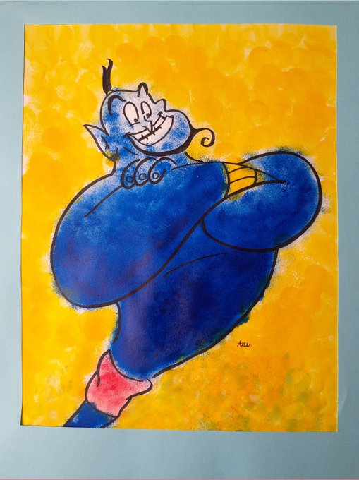 今日は大好きな作品のひとつ『アラジン』の公開日ということで、ジーニーを描いてみました🧞♂️✨ 線は筆、色は絵の具ポンポン手法?を使って塗っています。相変わらずムラあり、はみ出しありと下手くそですが、写真アップいたします🙇 #アラジンスクリーンデビュー #ジーニー #今月描いた絵を晒そう