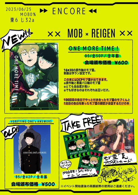 30 111 6.25 JB2023 MOB0% 東6 じ32a ENCORE おしながきです。 明日にはモブ霊本の新刊サンプルだします。pixivも同じタイミングに… 頒布物は新刊、既刊、無配で夏のモブ霊ポストカードとMOBREI SAIKOUミニシール👾あります 無配はお好きに持ってってください😈 通頒はイベント後残部を🐯に委託予定です。 23/06/22 01:42