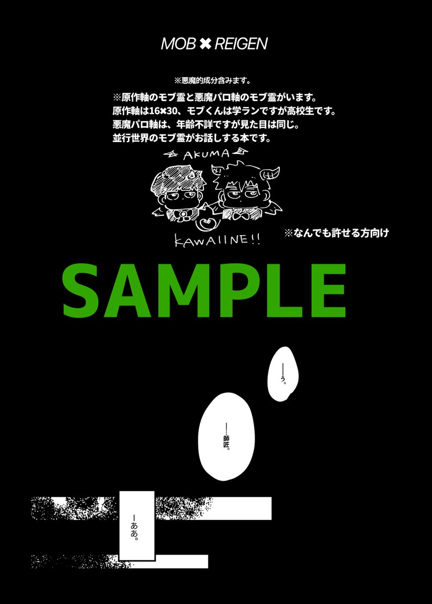 6/25 JB2023 MOB0% モブ霊新刊【ONE MORE TIME !】 全年齢/全50P/会場頒布価格¥600 1630の原作軸主体のモブ霊の告白の話。 悪魔パロのモブ霊も出てきますが基本お話しするだけです。 お品書き別ツイートにあります。 通頒はイベント後に🐯に委託予定です。 よろしくお願いします。 (1/3)