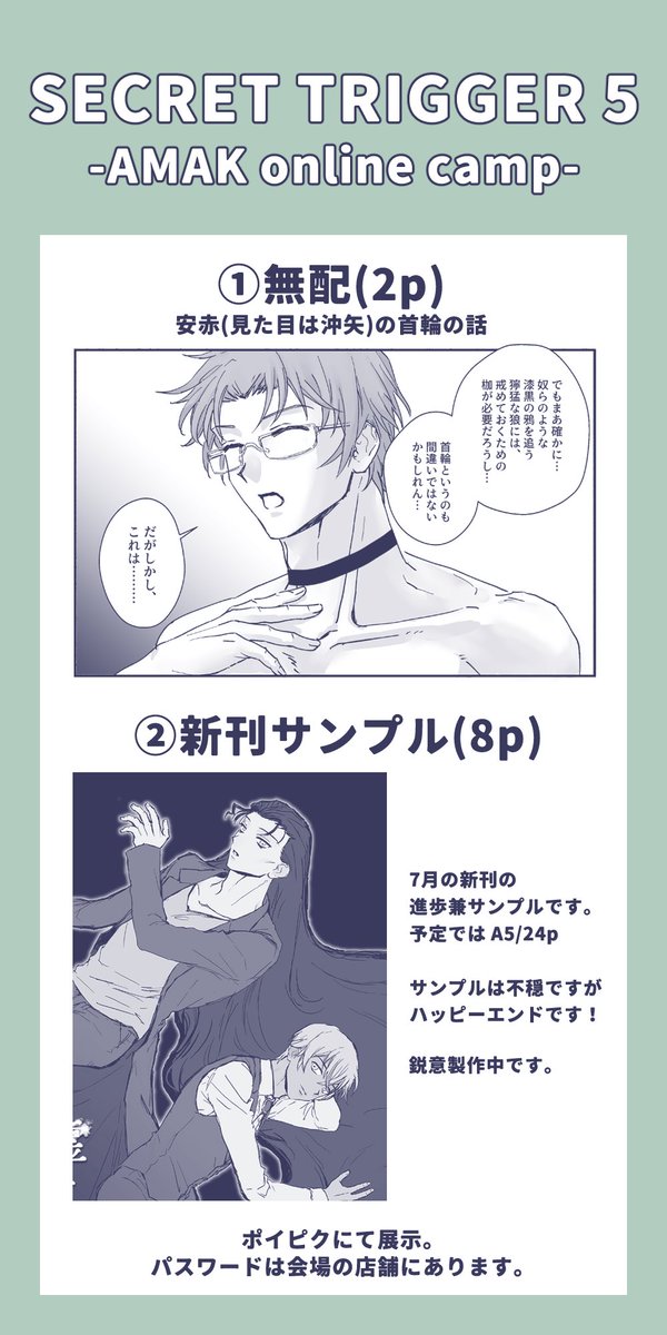 24 60 8/21 スパコミ関西 素顔のカーチェイス 新刊サンプル(1/2) 『ルー・ガルーは箱の中』 A5/20p/300円 安赤のつもりで描いてますがアカイはほとんど出てきません。 よろしくお願いします! 22/08/13 20:37