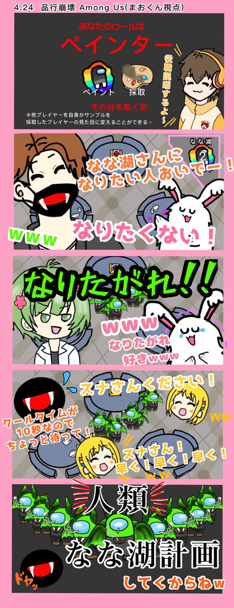 4.24 品行崩壊Among Us🎨 最初の役職説明での一コマ🟢 なな湖さんのなりたがれ私も好きです🤣 #まおしいらすと #スナザメ絵 #絵ルコン #なな湖大好きちゅちゅアモアス #いらすとりっぴぃ #品行崩壊 #品行崩壊AmongUs