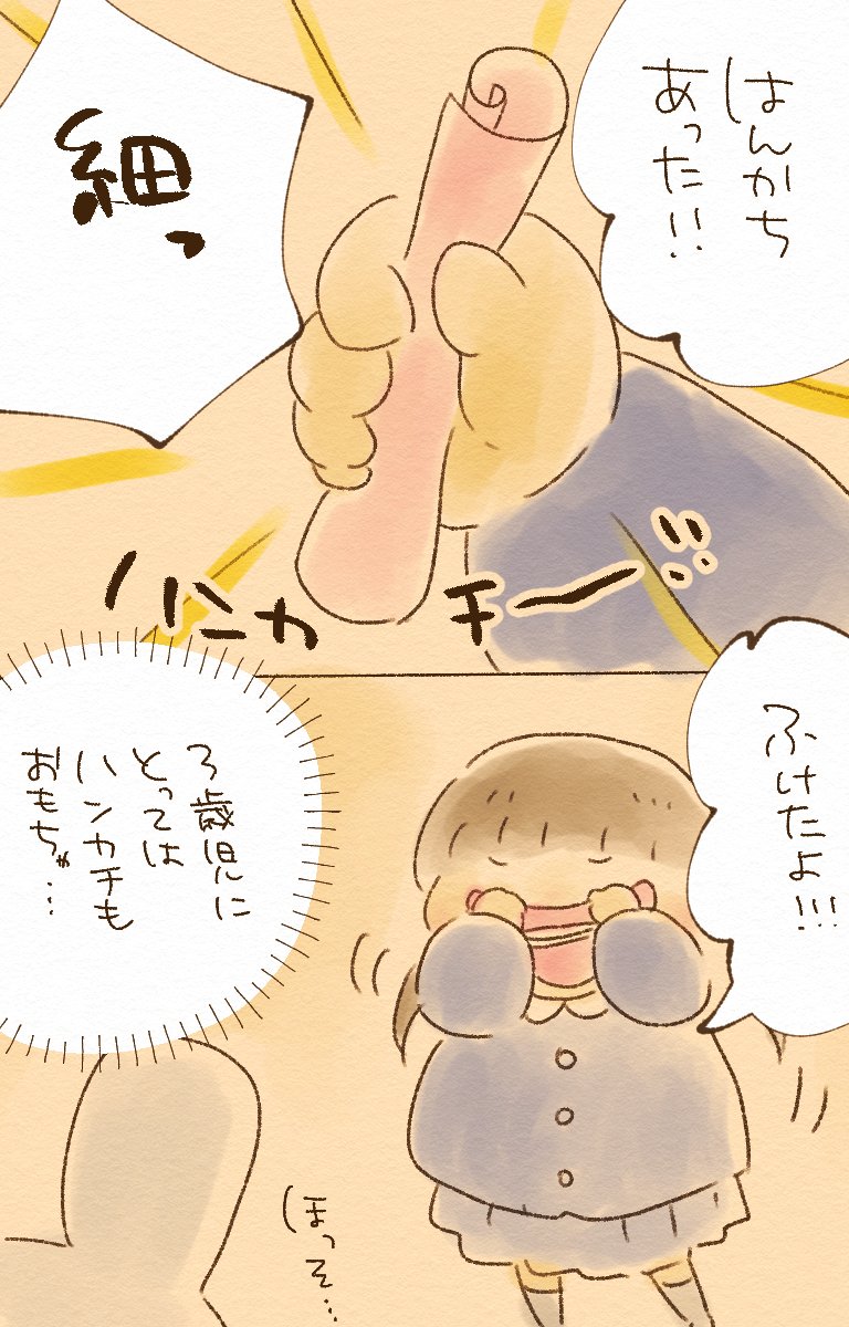 3歳児のハンカチって遊ばれたり拭かれたり激務やね #育児漫画 #育児イラスト #育児絵日記