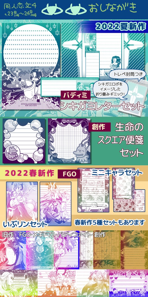 24 26 明日の同人便箋WEBオンリーおしながきと新作紹介です~! あ4・めめ です! 新作ないつもりだったんですけどバデミのシキくんレターセットと創作で生命のスクエア便箋ができました よろしくおねがいします #同人恋文4 #同人恋文4_info 22/07/22 20:43