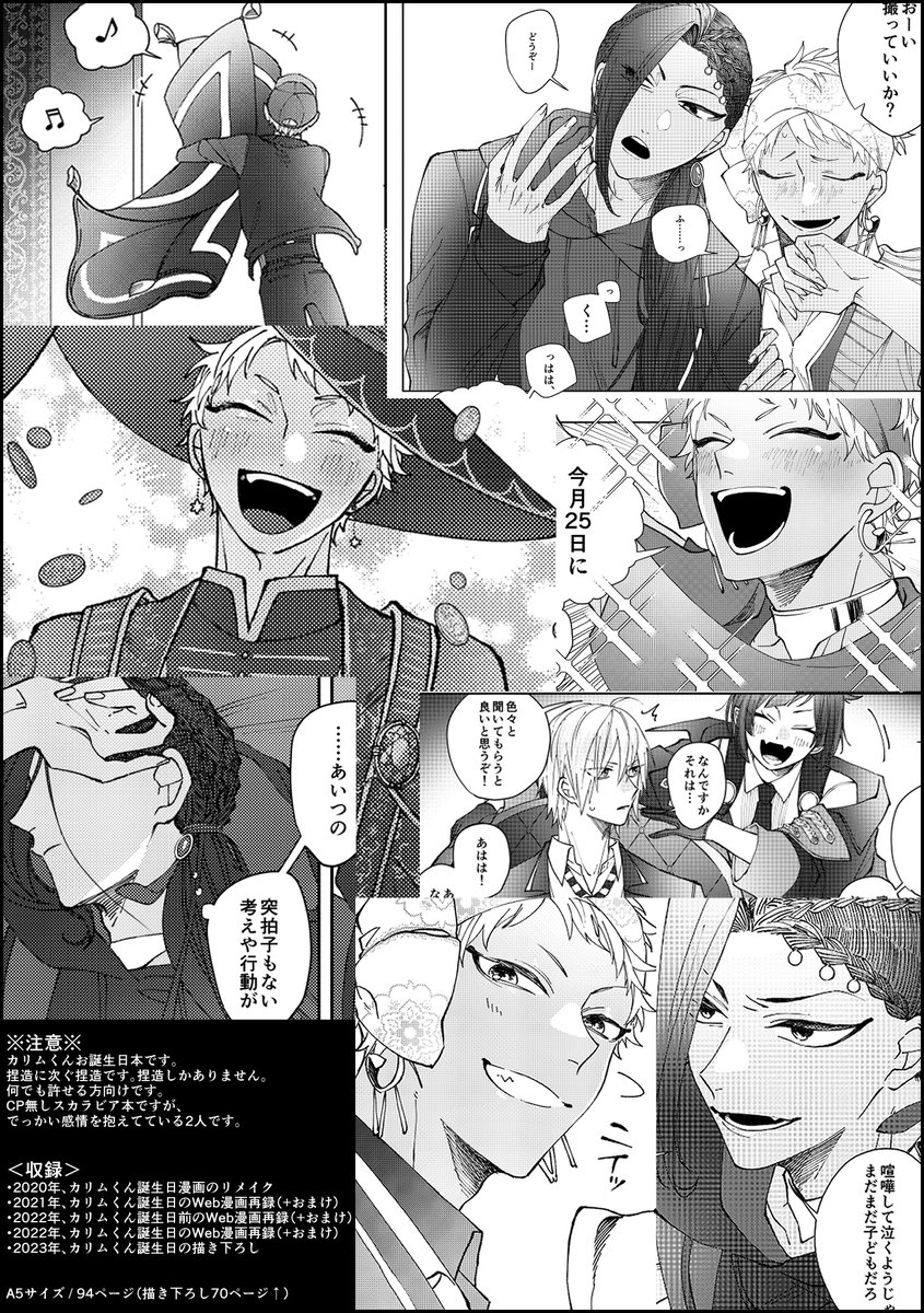 カリムくんの、誕生日にまつわるスカラビアふたりのお話いろいろ(4/4) A5/94ページ(Web再録+描き下ろし70ページ↑) 6月25日新刊です!宜しくお願いします!