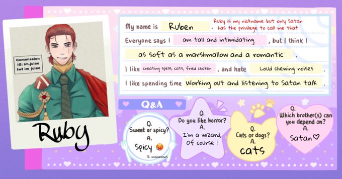 my obey me OC profile Name: Ruben Pronouns: he/him Height: 6’7 Type: Wizard Interests: creating new spells, cats, spicy food, and Satan Personality: cool calm and collected, and a romantic at heart OC drawn by @im_juleo #obeyme #obeymefanart #obeymemc #Commission