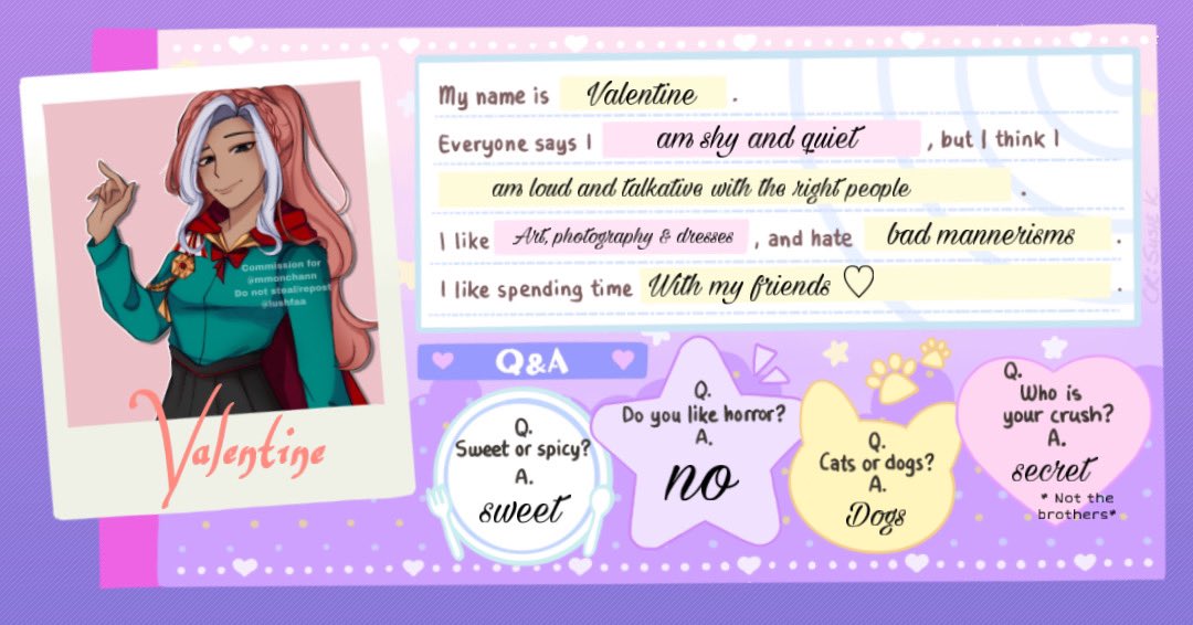 my obey me OC profile Name: Valentine Pronouns: she/her Height: 5’4 Type: Human Interests: Art, photography, buying and wearing dresses Personality: shy and warm but outgoing with friends OC illustrated by @lushfaa #obeyme #obeymefanart #obeymemc #Commission