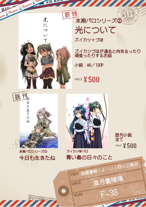 26 17 という訳で12/30(金)の新刊サンプルですー 末期パロ第3弾、瑞鶴先輩中心に色々と頑張るお話の完結編になっております。 表紙は38式さん(@sanpatisiki)、デザインはtamajamニキ(@tamajam)にお願いしました! A6/本文186P/500円です よろしくお願いしますー! 22/12/24 16:15