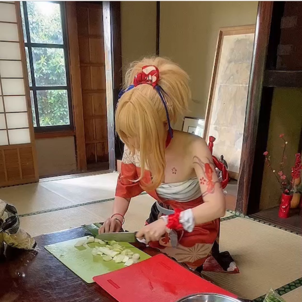 7 23 深夜なので謎にネギを切っている宵宮を投げておきます(完全なオフショ)(そもそも顔も写ってない) ウィッグは許してください料理中のため手袋はずしてます 22/05/17 00:24