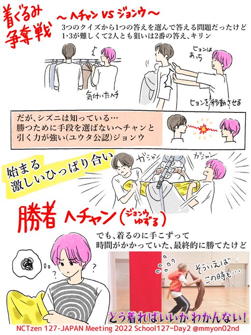 School127_DAY2 レポ画8 激しい争奪戦が、始まる前から予想された2人、壮絶でした😂最終的に引きずられるヘチャン でも、ヒョンなジョンウが譲ってヘチャンが勝ちました ただ着るのが遅くて、勝てたけど結構巻き返されていたという… #HAECHAN #JUNGWOO #NCT127 #School127 #シズニ集会 #NCTFanart