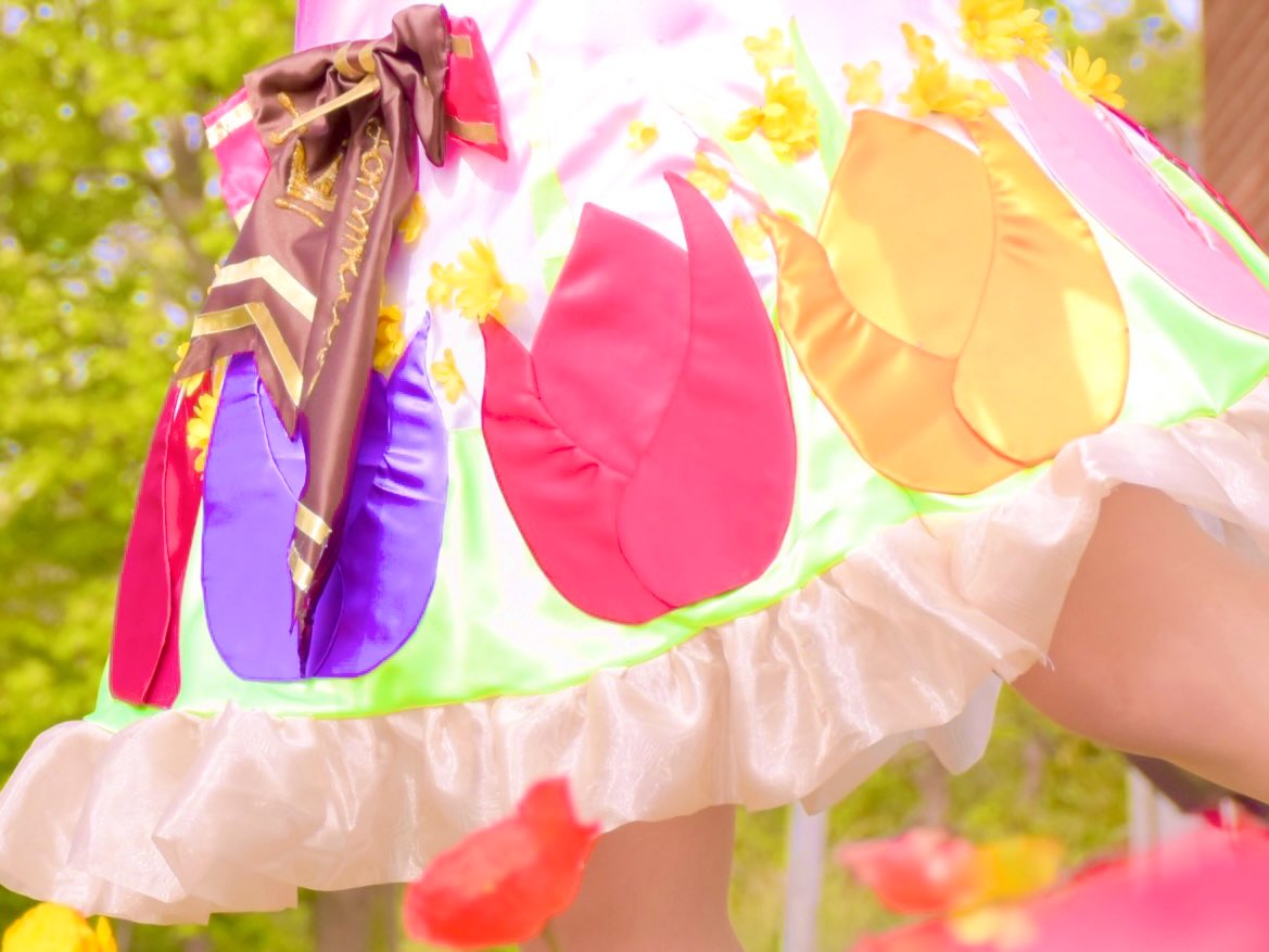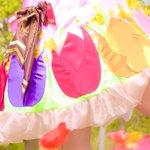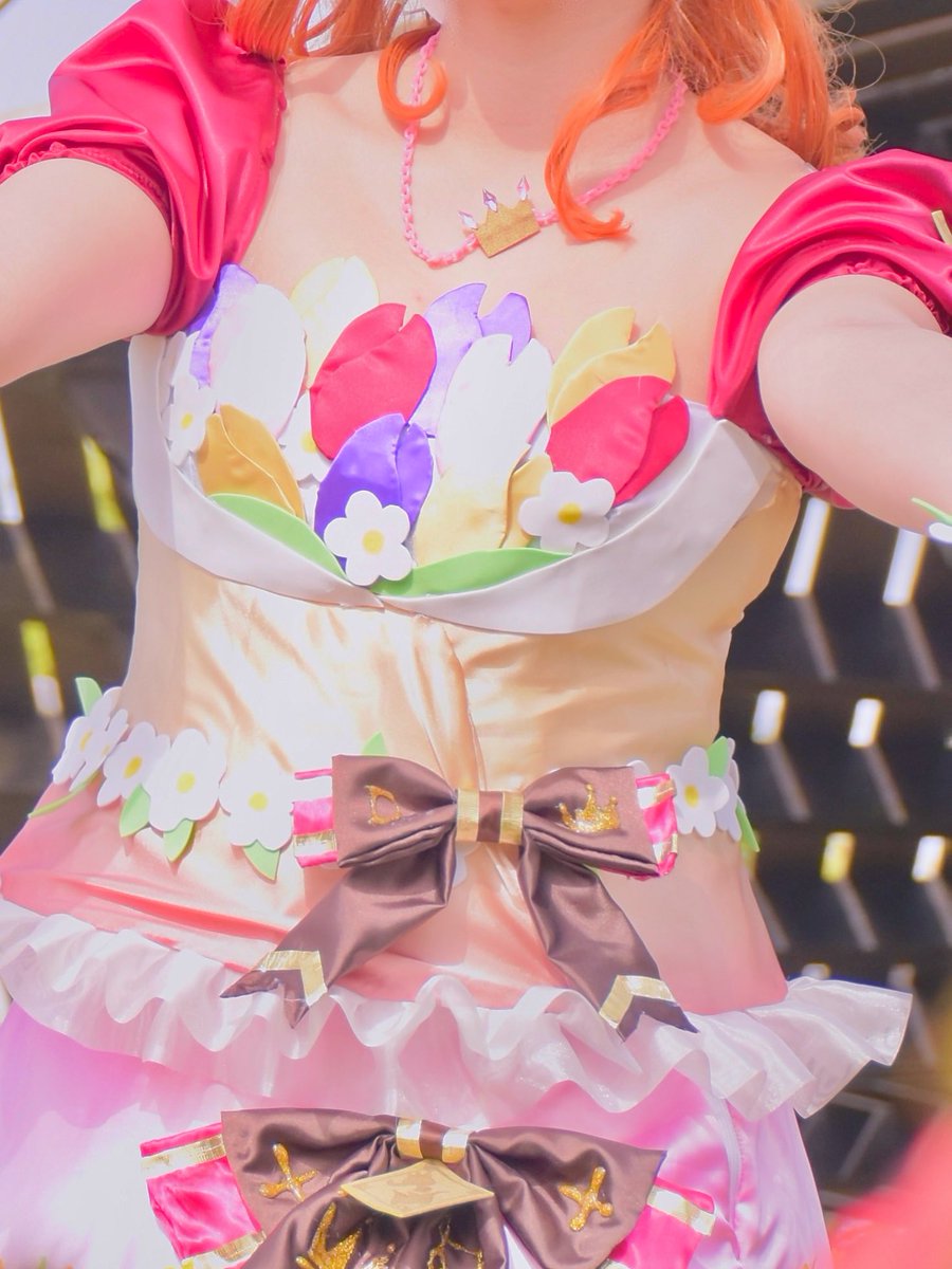 #manakaの修羅衣装 アイカツ! DreamyCrown👑 サンベリーナブーケコーデ🌷 布しばらく眠らせててやっと作りました😂春に間に合ってよかった! チューリップは画用紙に布貼り付けて製作、リボンの柄は金のグルーガンで描きました🙌 白い花もボード切って作ったよ〜 トップスの形作るの難しかった🥹