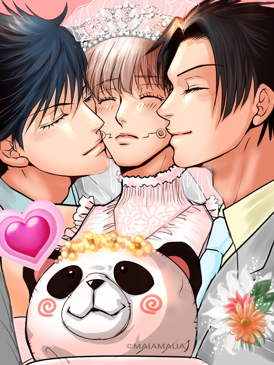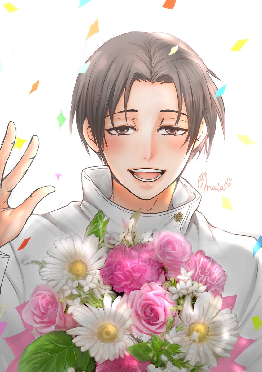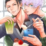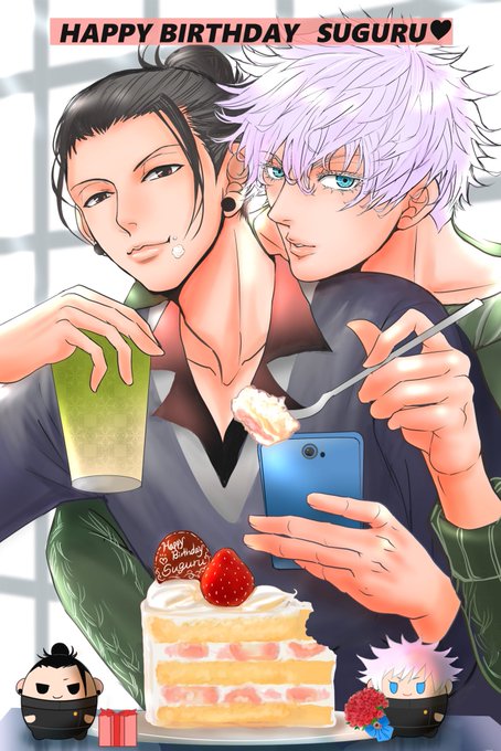 おはようございます✨😆 今日一日傑様のお誕生日をお祝いしまくります! 2枚目は仲良く2人で❤️ おめでとうメールが沢山届いてチェック中の傑にケーキ食べさせる悟 「すぐる💕あーん!」 「そんなに入らないよ」 #夏油傑誕生祭2023 #夏油傑生誕祭2023 #呪術廻戦ファンアート