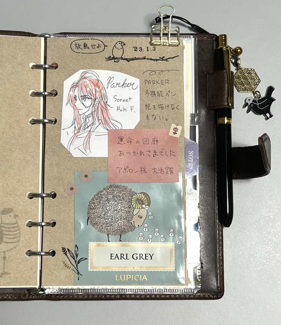 PARKERの多機能ソネットを久々に引っ張り出してみた。絵も描けるんだけど、やっぱりダマと乾きの遅さがちょっと気になるところ。ルピシアのアールグレイおいしいね☕️ #誰に見せるでもない手帳のらくがき