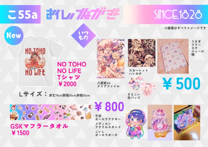 34 83 第二十回例大祭 おしながき🥳 rattoのサークル「Since.1828」は【こ55a】です! 新刊・新グッズは 🟡ざっくり東方 🟡NOTOHO NOLIFE Tシャツ 🟡GSKマフラータオル 既刊は在庫少ないのもあります ご了承ください 23/04/29 22:26
