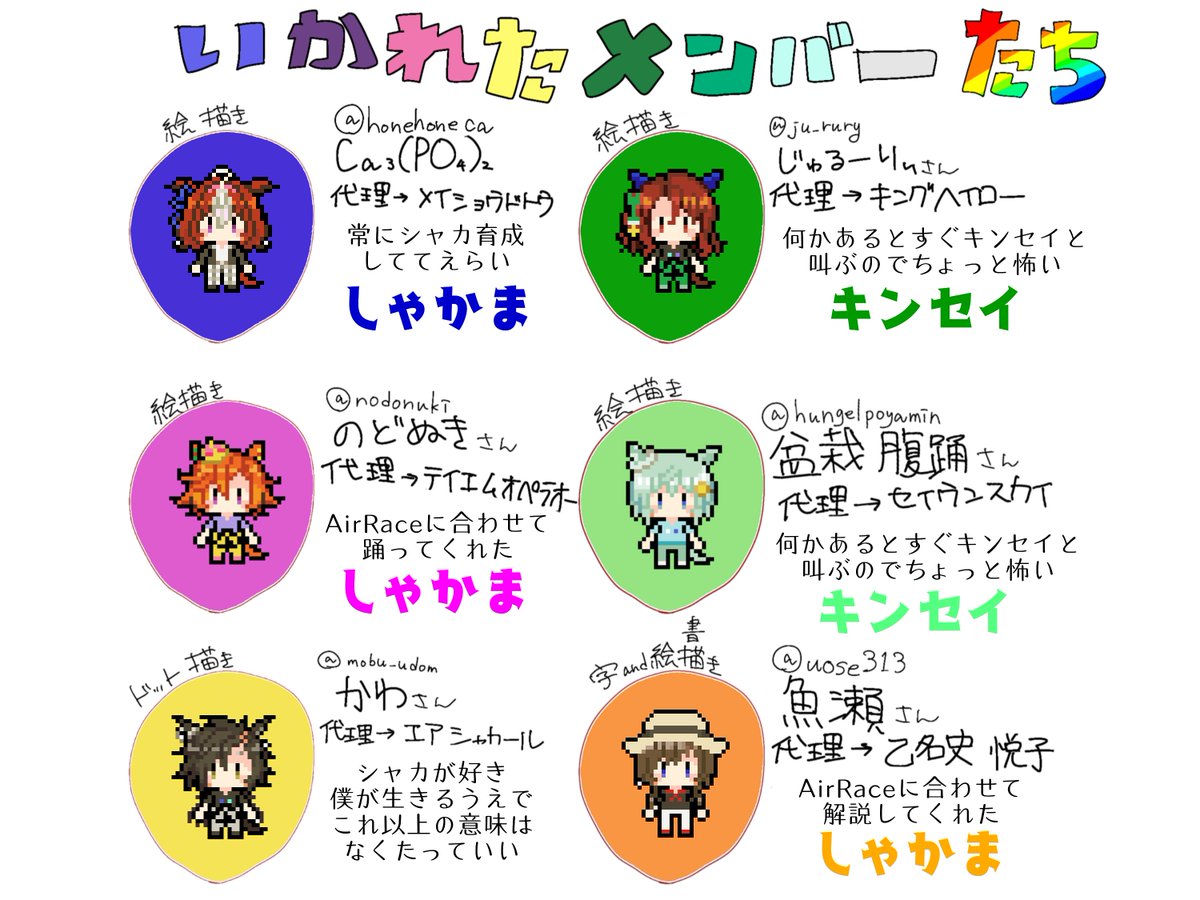 先日、オフ会に参加させていただきましたので記念絵を描きました! リン酸カルシウムさんがメンバー紹介テンプレートを作ってくれたのでそちらも記載させていただきました! オフ会とっても楽しかったです~!! twitter.com/nodonuki/statu…