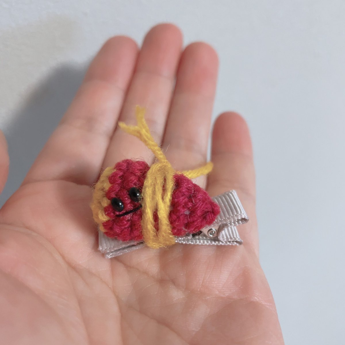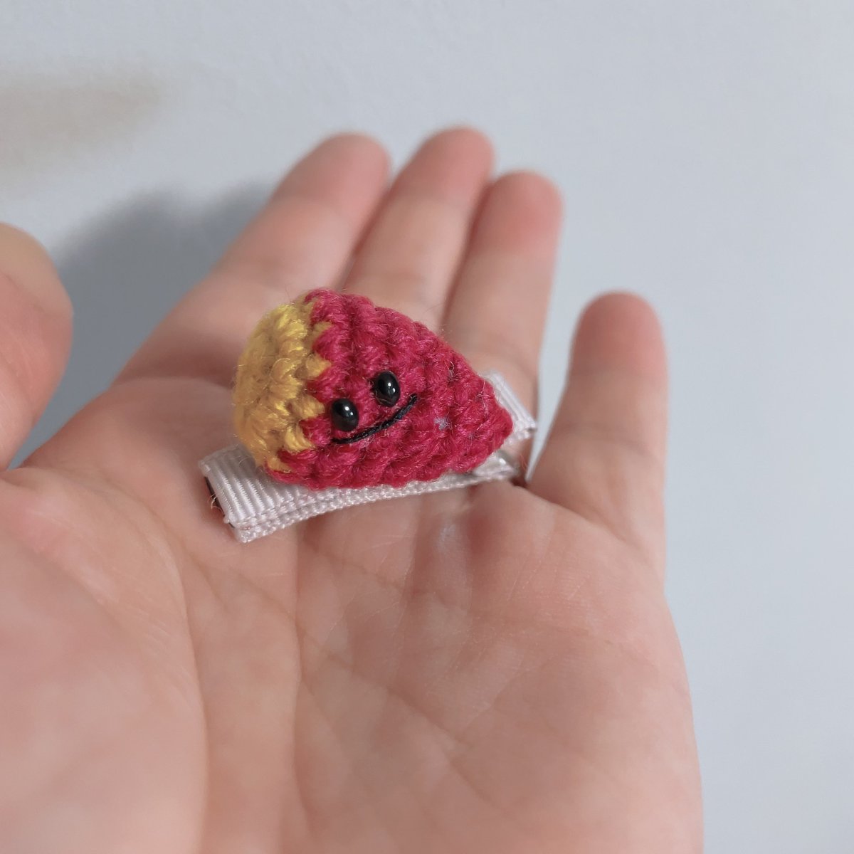 秋はさつまいもですね。ベビーヘアピンさつまいもくんVer. 2枚目は接着固定の図🍠 #あみぐるみ #mocch!